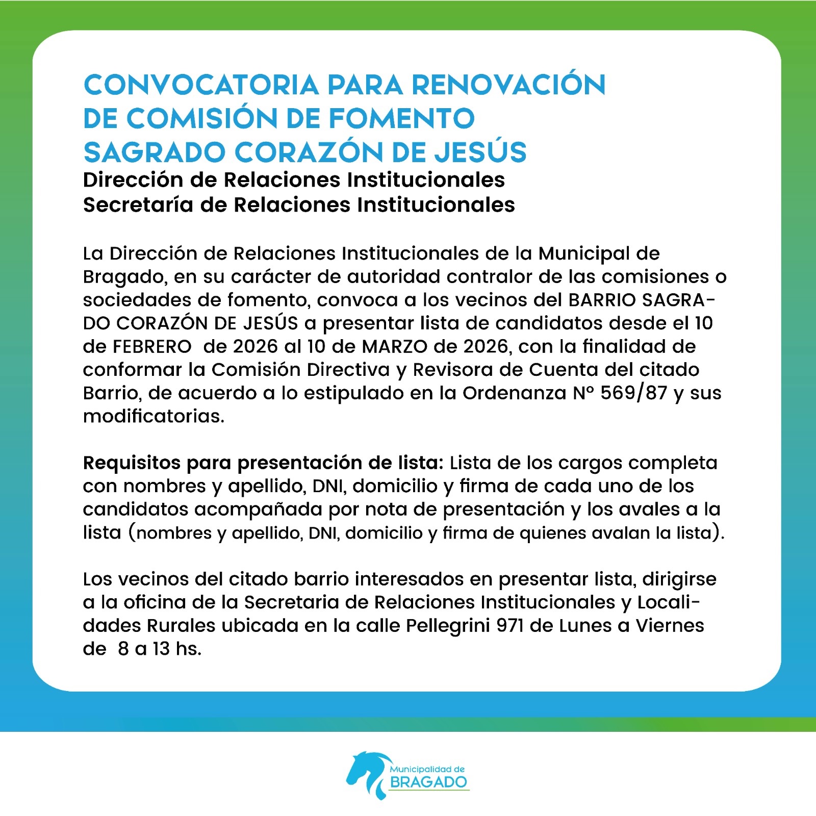 La Dirección de Relaciones Institucionales de la Municipal de Bragado, en su carácter de autoridad contralor de las comisiones o sociedades de fomento, convoca a los vecinos del BARRIO SAGRADO CORAZÓN DE JESÚS a presentar lista de candidatos desde el 10 de FEBRERO de 2026 al 10 de MARZO de 2026, con la finalidad de conformar la Comisión Directiva y Revisora de Cuenta del citado Barrio, de acuerdo a lo estipulado en la Ordenanza Nº 569/87 y sus modificatorias.