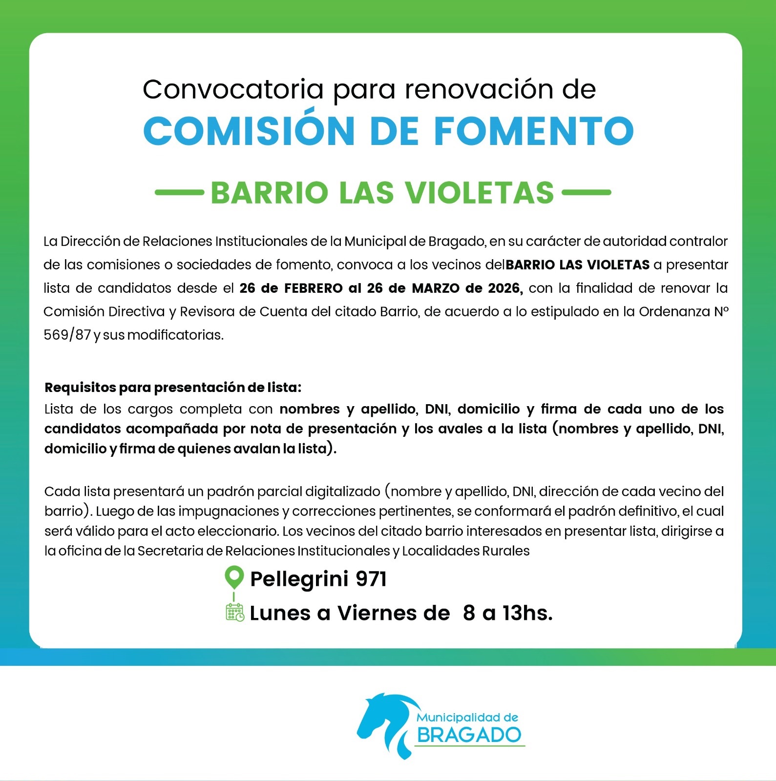 La Dirección de Relaciones Institucionales de la Municipal de Bragado, en su carácter de autoridad contralor de las comisiones o sociedades de fomento, convoca a los vecinos del BARRIO LAS VIOLETAS a presentar lista de candidatos desde el 26 de FEBRERO al 26 de MARZO de 2026, con la finalidad de renovar la Comisión Directiva y Revisora de Cuenta del citado Barrio, de acuerdo a lo estipulado en la Ordenanza Nº 569/87 y sus modificatorias.