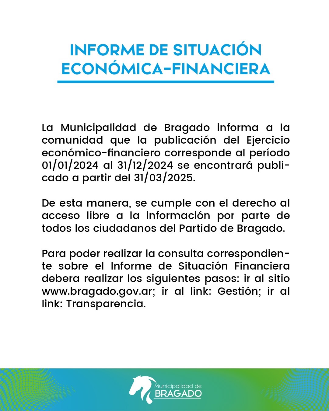 La Municipalidad de Bragado informa a la comunidad que la publicación del Ejercicio económico-financiero corresponde al período 01/01/2024 al 31/12/2024 se encontrará publicado a partir del 31/03/2025.