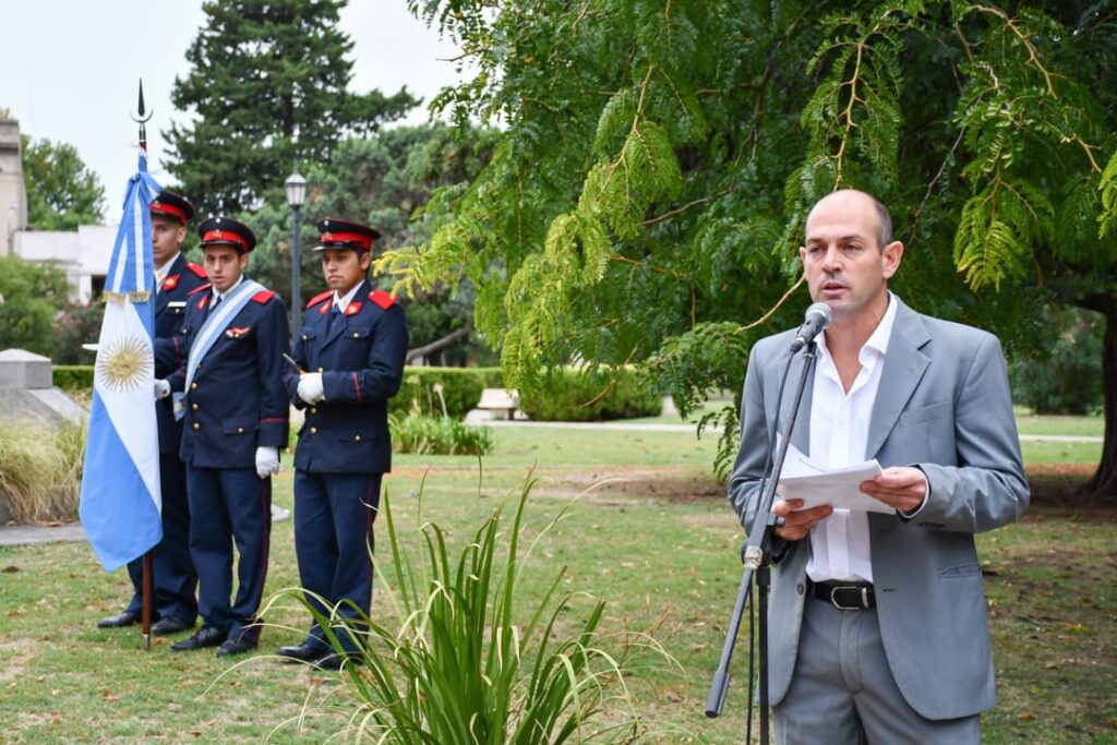 Luego, el orador del acto en representación de la Municipalidad, el secretario de Gobierno, Esteban Burga, expresó: «Nos encontramos en esta plaza, para honrar el momento en el que Bragado dejó de ser un punto en el mapa para covertirse en un destino y un refugio de nuestros sueños».