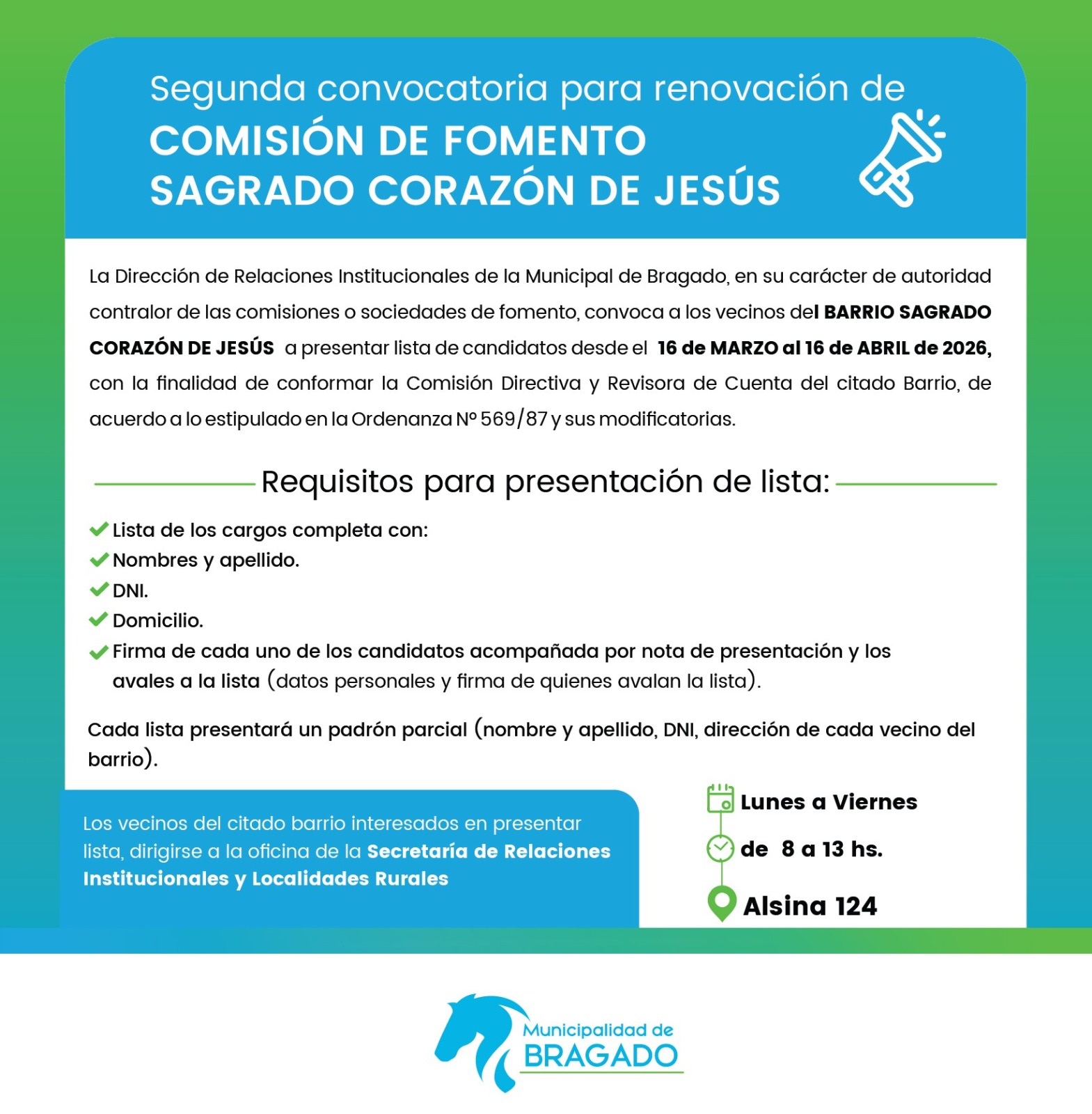 La Dirección de Relaciones Institucionales de la Municipal de Bragado, en su carácter de autoridad contralor de las comisiones o sociedades de fomento, convoca a los vecinos del BARRIO SAGRADO CORAZÓN DE JESÚS a presentar lista de candidatos desde el 16 de MARZO al 16 de ABRIL de 2026, con la finalidad de conformar la Comisión Directiva y Revisora de Cuenta del citado Barrio, de acuerdo a lo estipulado en la Ordenanza Nº 569/87 y sus modificatorias.